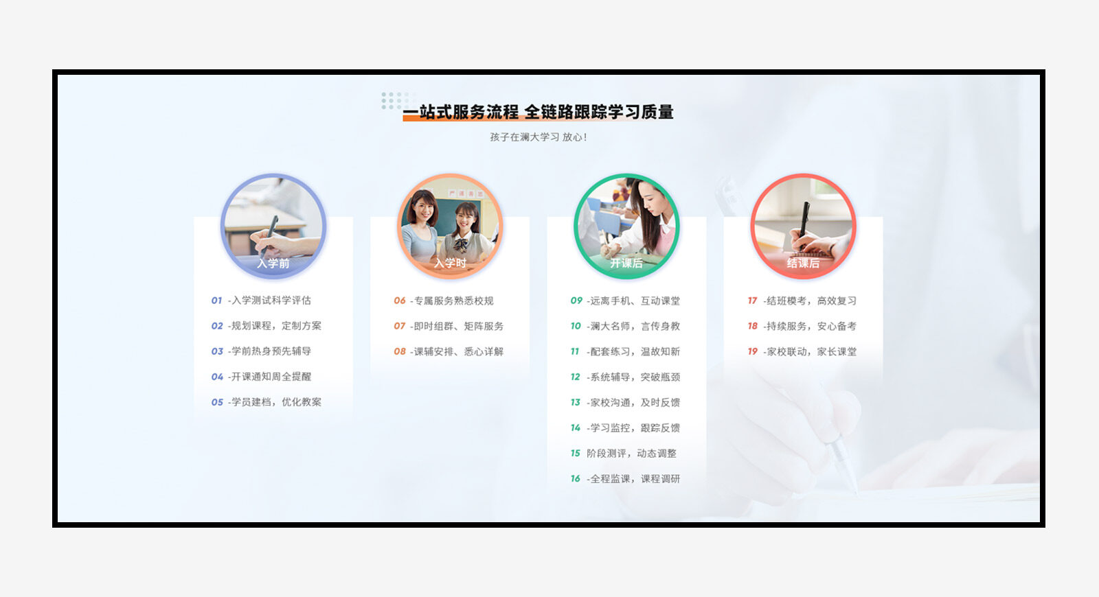 “因?yàn)樽约旱暮⒆恿苓^雨,所以想為別人撐一把傘。”學(xué)生和家長不是客戶客人,是我們的親人家人。自創(chuàng)立伊始至今,瀾大教育始終將“愛與真誠、愛與責(zé)任、愛與耐心”作為員工行事的第1準(zhǔn)則,為萬千家庭提供高質(zhì)量的教學(xué)服務(wù)。